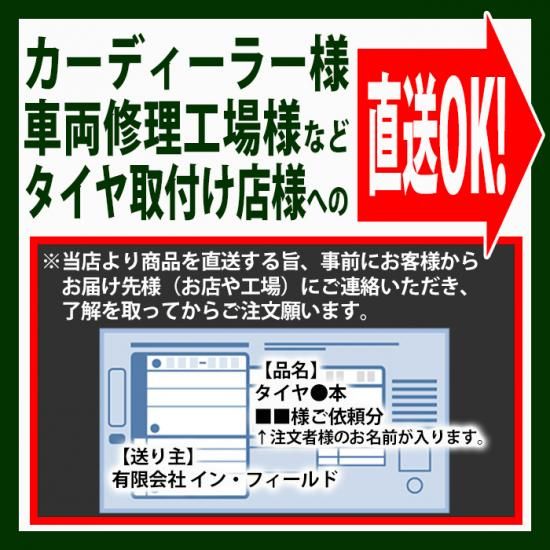 以下よりお選びいただけます。 【前払い】 ・クレジットカード(分割・リボ・ボーナス払いOK) ![]() ・銀行振込 −PayPay銀行 −楽天銀行 −ゆうちょ銀行 【代引き】 ・佐川急便の商品代引きにて発送いたします。 (お支払いは現金のみとなります) 【後払い】 ・NP後払い決済 ★ご利用にあたり審査がございます。審査結果によっては「NP後払い」を ご利用いただけない場合がございます。 詳しくは「お支払いについて」をご参照ください。 お支払い方法により異なります。 前払いの場合:ご入金〜5営業日程度でお届け 代引きの場合:ご注文〜5営業日程度でお届け 後払いの場合:審査完了〜5営業日程度でお届け ※在庫が弊社倉庫にある場合、平日15時・土曜13時までご注文・ご入金分は当日出荷いたします。(休業日を除く) ※お客様になるべく早く商品をお届けするため、受注後は順次出荷を行っております。運送会社集荷後はキャンセルすることが出来ません。 出荷後はキャンセルではなく、お受け取り後のご返品(お客様都合の為送料お客様ご負担)となりますのでご注意下さい。 タイヤは佐川急便、カー用品は原則としてヤマト運輸にてお届けいたします。 ※ご購入内容・お届け先によっては、カー用品も佐川急便でのお届けに変更させていただきます。 ※法人様宛にタイヤ商品をお届けする場合、当店にて福山通運へ変更させていただく場合がございます。 ★カーメンテナンス用品は何本買っても送料600円!★ ※ただし沖縄など・離島は別途「離島中継料」を頂戴します。 ※一部定形郵便(0円)・クリックポスト(+185円)の取り扱いも開始しました。ご注文時にお選びいただける商品のみ対象です。 ご購入内容によっては、こちらも佐川急便に変更させていただく場合がございます。 ※下記の決済手数料は別途頂戴いたします。 下記のお支払い方法の場合、それぞれ所定の手数料を頂戴いたします。 【代引き手数料】 合計金額 〜3万円未満 ・・・ 440円(税込) 合計金額 〜10万円未満 ・・・ 660円(税込) 合計金額 10万円以上 ・・・1,100円(税込) 【後払い手数料】 190円(税込) 返品は未開封・未使用のもののみ、到着後1週間以内に電話またはメールにてご連絡いただいたもののみお受けいたします。 返品の送料・手数料については、初期不良の場合は当社が、それ以外のお客様都合による返品につきましてはお客様にてご負担いただきます。 ★返金について 返品商品到着確認後3営業日以内にご指定口座にお振込致いたします。 ★返品連絡先 電話番号:0120-897-180 メールアドレス:shop@in-field.co.jp 在庫情報は常に更新していますが、他サイト等でも出品しているため、万が一在庫切れとなってしまった場合は取り寄せ等で1〜3ヶ月お時間を頂く場合がございます。あらかじめご了承ください。 ・当店商品の表示価格は消費税込みの価格となります。 ・万が一、お届けの商品に不備(破損や商品間違い)があった場合は速やかに交換または返金させて頂きますので弊社までご連絡ください。 サイズ誤りやキャンセルなど、お客様都合の返品の場合は商品到着後7日以内で未使用・未開封の場合に限りお受けいたします。 なお、所定の手数料を頂戴いたしますのであらかじめご了承ください。 ・その他、ご不明な点がございましたらお気軽にお問い合わせください。
